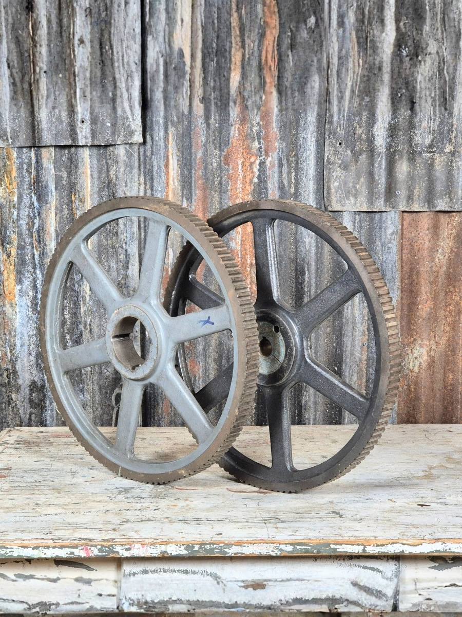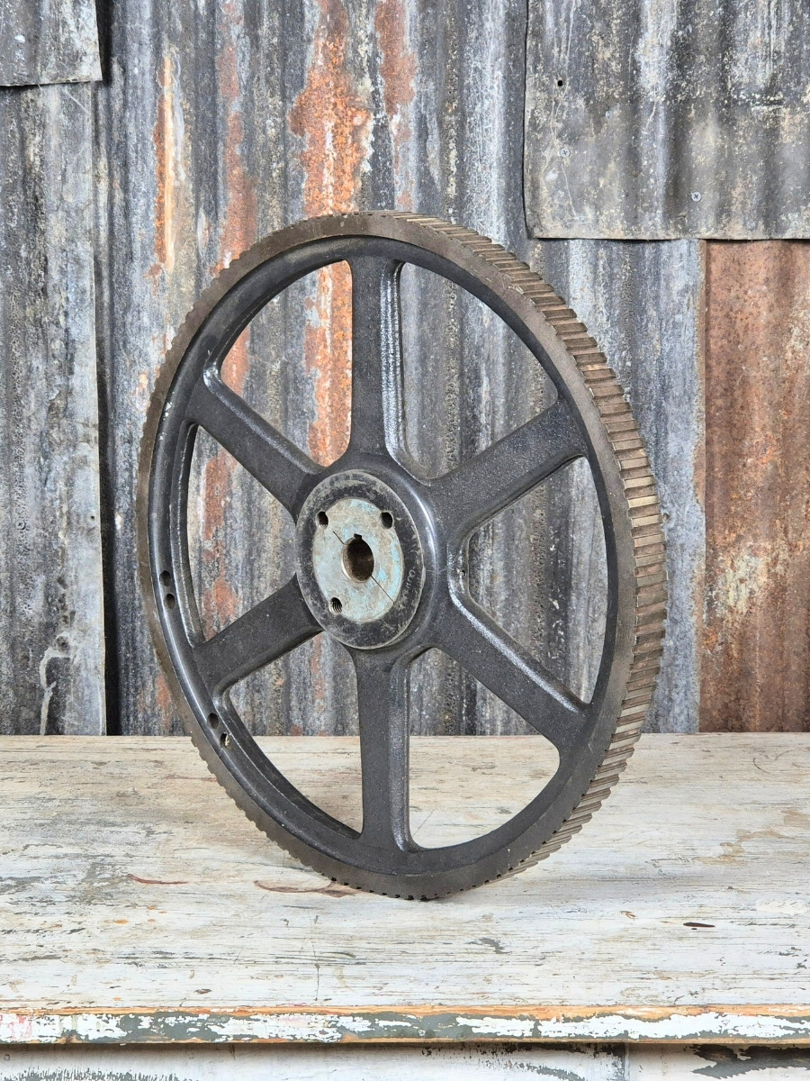 Een robuust en karaktervol gietijzeren tandwiel met een industriële uitstraling. De zware uitvoering en de zichtbare slijtage geven dit stuk een krachtig en doorleefd karakter.