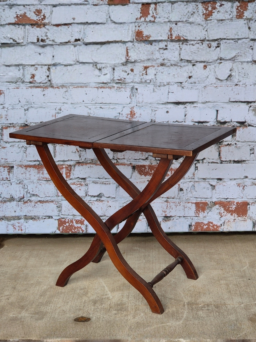 Een houten bijzettafel met een inklapbaar onderstel en een elegante, kruisvormige constructie. De warme houtkleur en de slanke lijnen geven het geheel een rustige en tijdloze uitstraling.