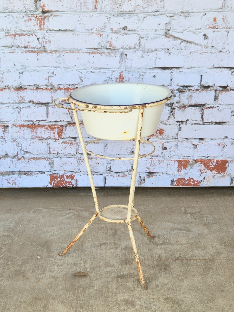 Vintage wastafel met geemailleerde waskom met 1 schapje Staat: Bak is lek