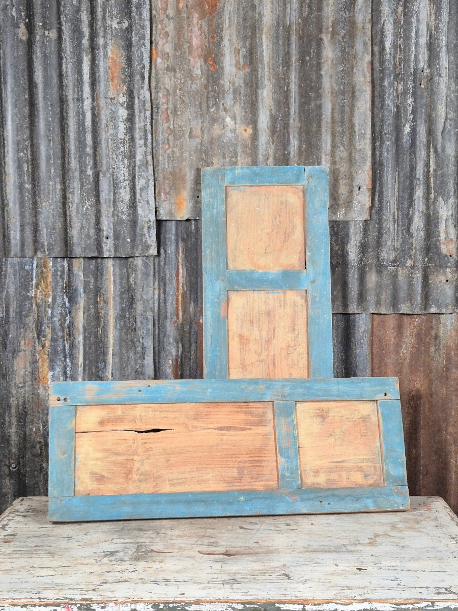 De panelen tonen zichtbare houtstructuren en lichte gebruikssporen, wat bijdraagt aan het authentieke karakter. De eenvoudige indeling en het verweerde oppervlak maken dit tot een decoratief stuk met een verhaal.