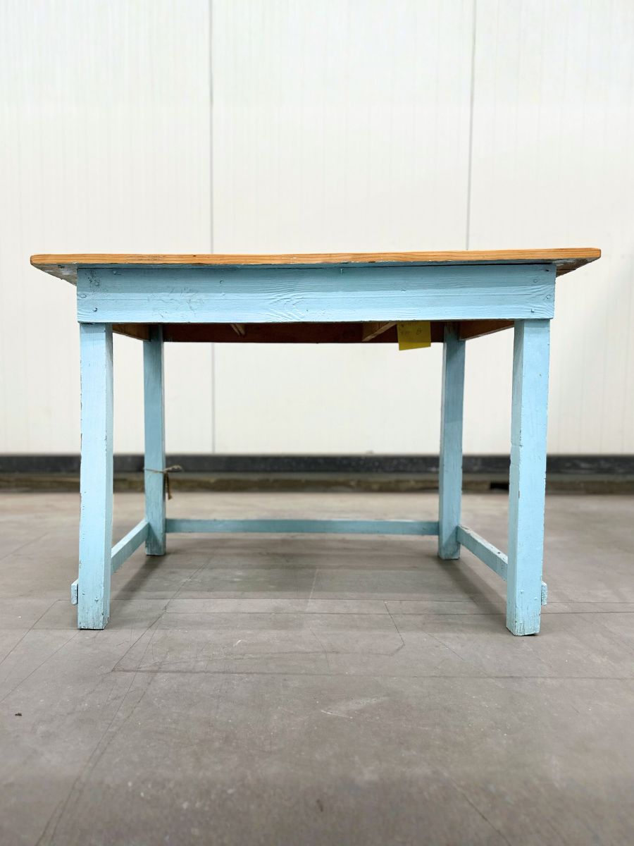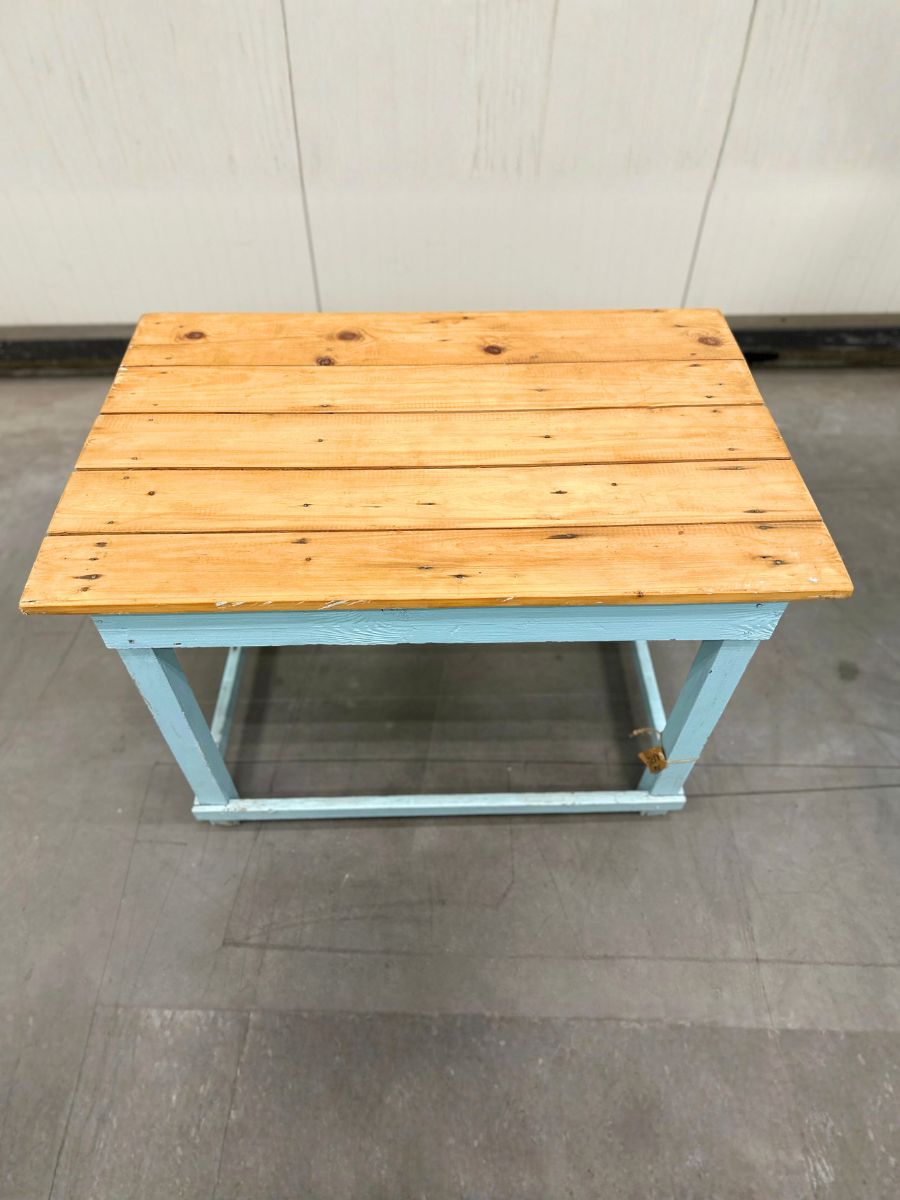Fris blauwe houten bureau met een robuust houten blad