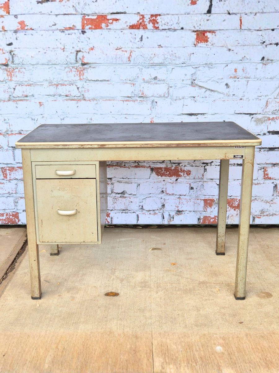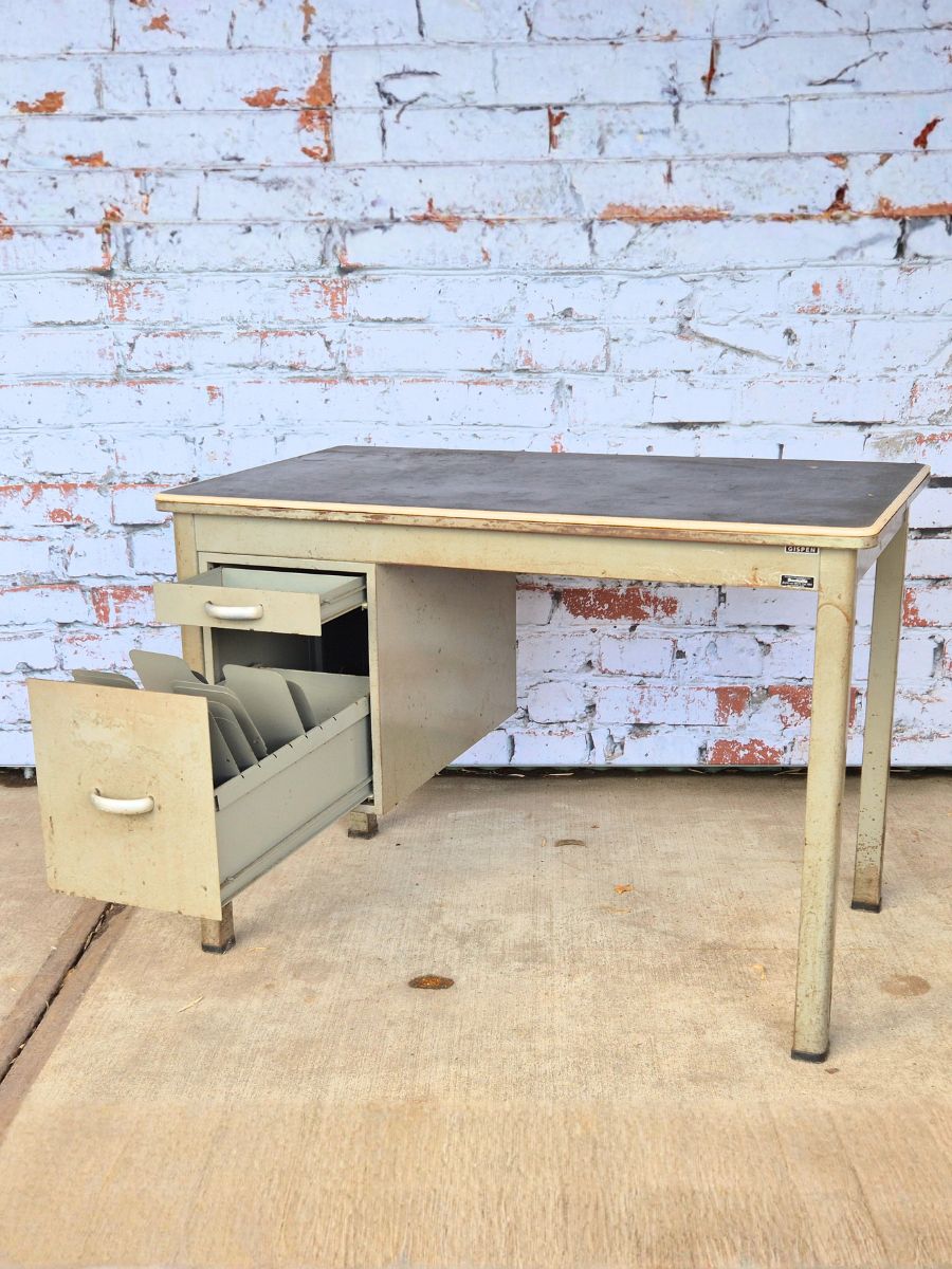 Stoer vintage industriëel bureau van het merk Gispen met 2 lades. Waarvan 1 met dossier indeling.